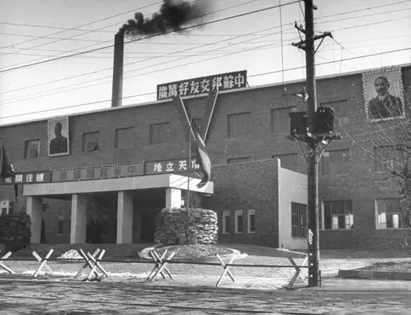门框上写着“中华民国万岁”,墙上有蒋介石画像,房顶上写着“中苏邦交友好万岁”,它原来是一家日资银行总部。