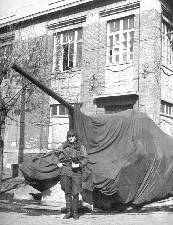 1946年3月,沈阳,苏联人将坦克开到城市的街道转角处,用帆布遮盖,一个苏联士兵端着冲锋枪在前面。