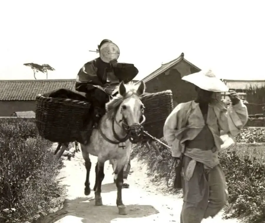 这个场景最熟,前头的男人牵缰绳,身上系着粗布腰带,骡背两侧挂着大号柳筐,妇人坐中间,手里一把团扇遮脸,老辈人忌讳照相,说“摄魂机”会把魂吓跑,男人就把草帽往下一拉,路是土路,太阳毒,影子全被晒得发白,那会儿回门没有车马喇叭,有的是脚下的尘土和路边的野花