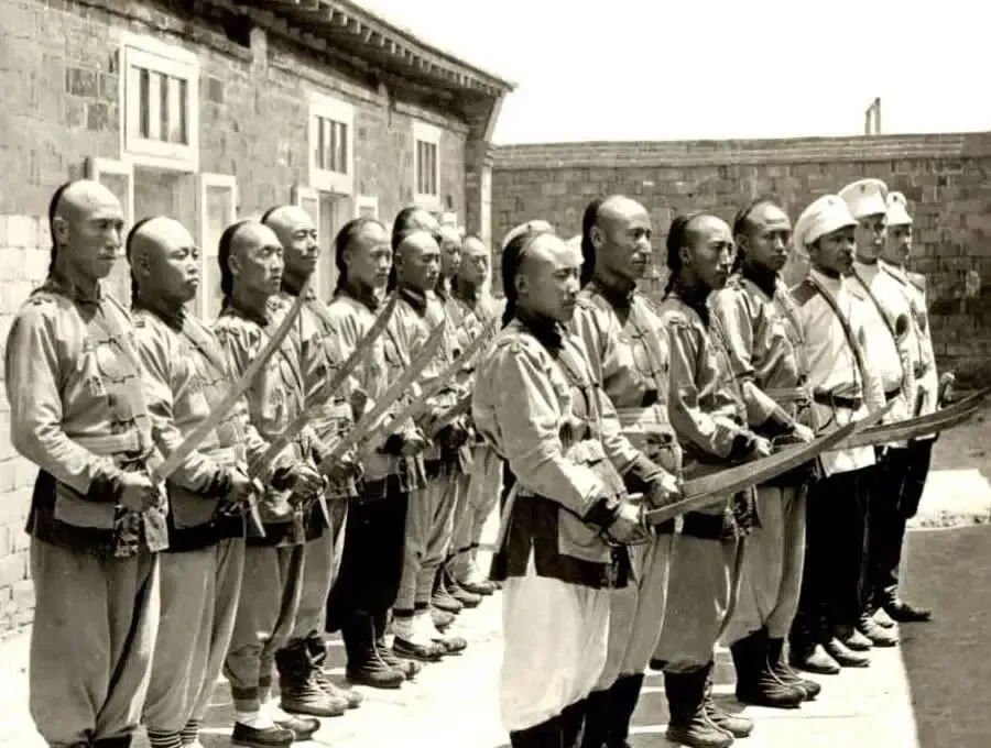 图中这群人手里的宽背刀叫雁翎刀,刀镡圆润,刀鞘绑在腰侧,站成一溜儿,辫子垂在脑后,旁边还有戴白盔的洋装军官,口令一落,刀尖一齐抬起,阳光一晃,寒光像水一样流过去,听说是租界里训练出来的队伍,管的却是城里自家的百姓,这种滋味,老一辈不愿多提。