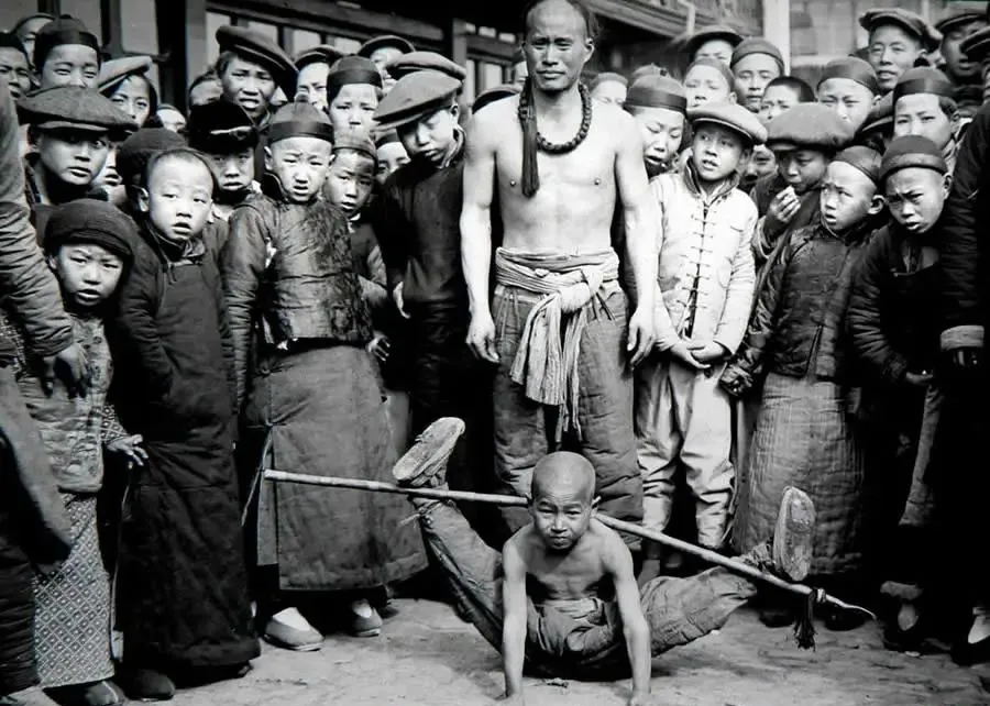 这对父子走南闯北,叫江湖卖艺,父亲赤着上身扛铜链子,儿子把脚别在杆上往后一仰,背上青筋一鼓一鼓的,围了一圈看客,冬天个个穿棉袍,台上却得光着膀子,表演完,父亲抱拳一揖,铜碗叮当两声,收不上几个钱也得笑,妈妈看见这张照片叹气,说小时候路过戏班子,最怕看到小孩子咬牙撑着的那一刻。