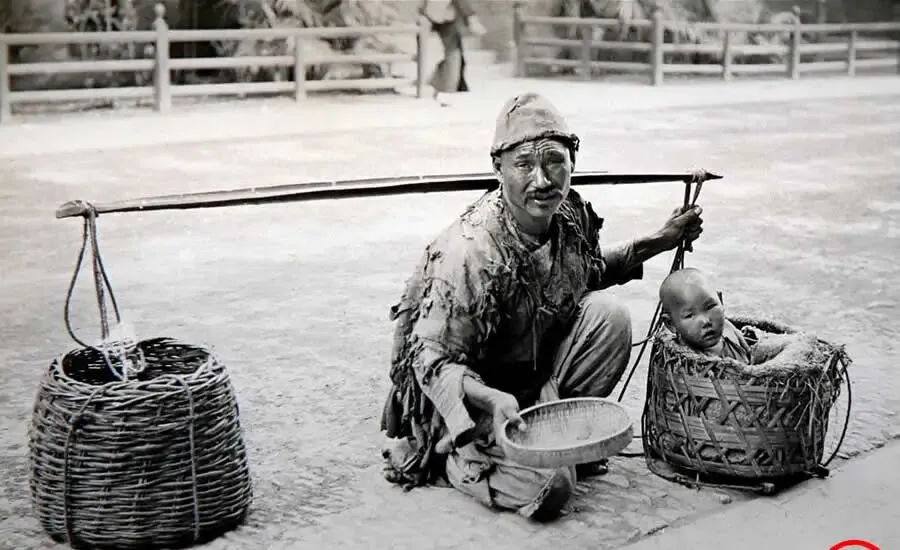 这个男人挑着扁担跪地讨口吃的,前筐放着婴孩,后筐装着锅碗被褥,衣服破到见绒见线,手里捧个筛子,路人一走近他就点头哈腰,孩子困了就往草里一缩,爷爷说那几年闹灾,能走能挑的就往城里涌,只要肩上有根担,心里就还撑着一口气,现在人穷极了还能求助,那时只有天。