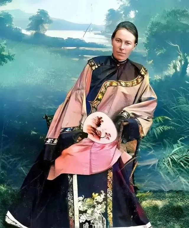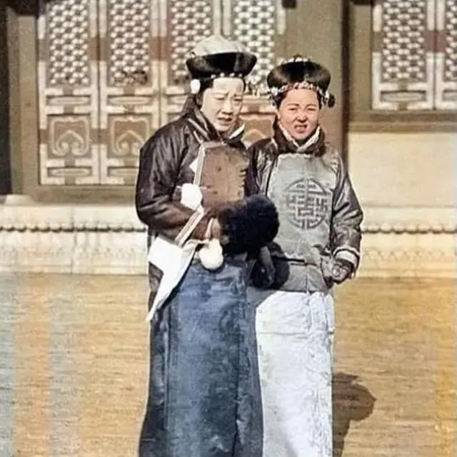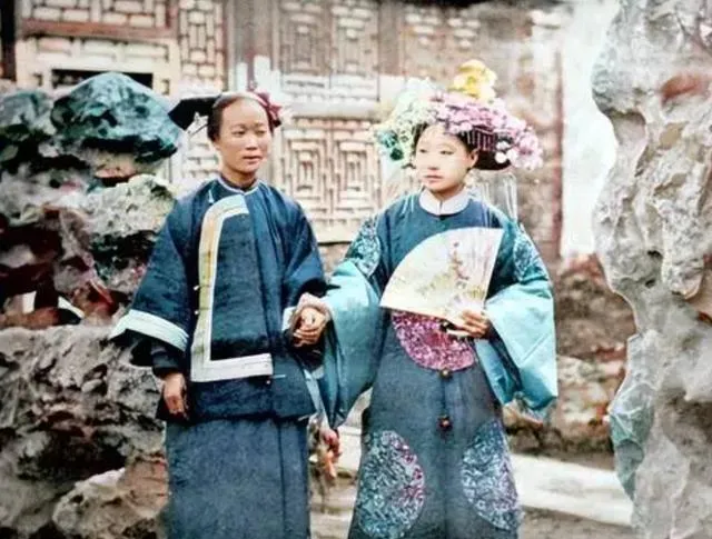 图中这身厚实的皮领叫貂裘领,黑亮的边子贴着腮,外罩缎面短袄里头叠棉,袖口一圈白色滚毛,冬天院子里走一圈,风是割脸的,裘领往上一提就只露出眼睛,奶奶看了这张说当年她婶婶也这么裹着,手里攥个团扇不扇风,只当个架势。