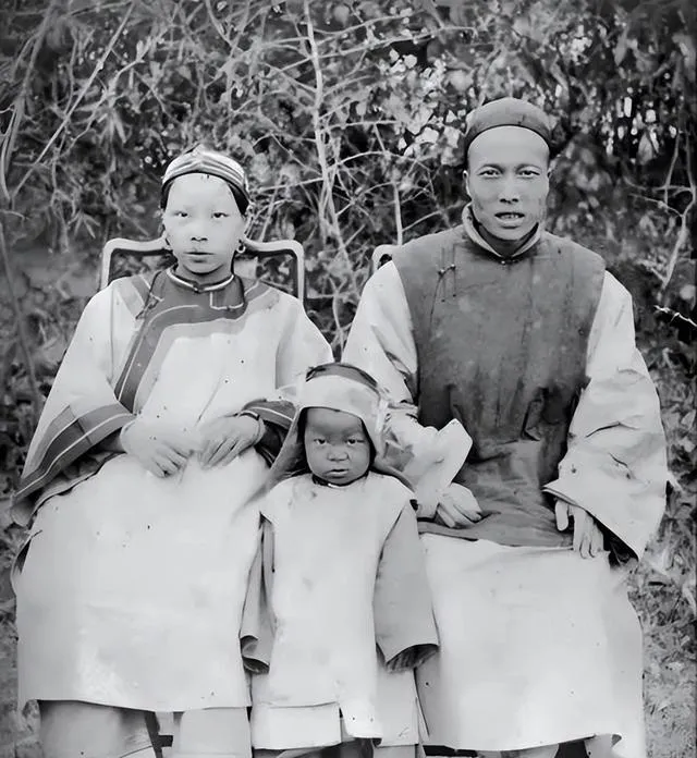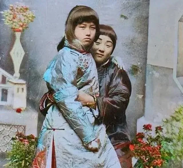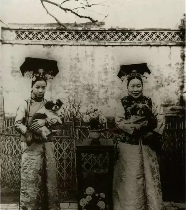 这两只毛茸茸的是宫里常养的狮子狗,小身板儿大毛量,趴在袖口就像团活棉,女子戴着大幅头面,绣花云肩亮汪汪,拍照时还特地把狗抬高一点,好让人看清楚它们的面子,那会儿宠物是身份的摆件,现在呢,多半成了家里的小祖宗。