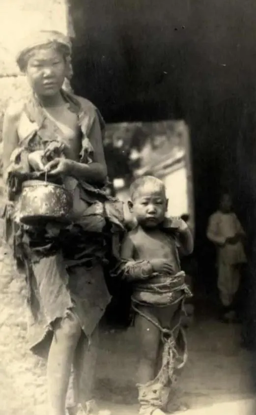这个难受的场景就叫讨饭命,哥哥胳膊上挂着破铝壶,灶火味透着酸,弟弟腰间缠布条,裤腿拖地一截一截,眼神直直的,像在盘算下一顿在哪儿。