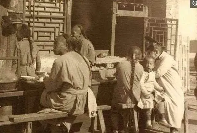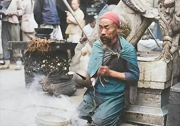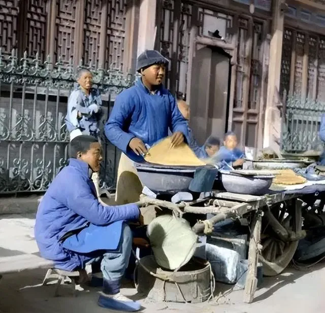 这桌板凳一摆就是小饭摊,锅里咕嘟着骨汤,来客把辫子一甩坐下,掌柜的端碗不抬眼,另一张是煎饼摊,薄面一抹,铲子一挑就翻面,香味顺风拐过巷口,馋得小子们围着转圈。