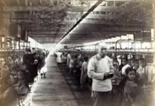 这两张都在车间里,长溜溜的纺机把嗡声拉得老长,个头还没机器高的小女工排成一线,手指在梭口里飞快捻线,班头挎着记事本来回走,敲一下木柱提醒别走神,过去人多活儿紧,现在看着心里发酸。