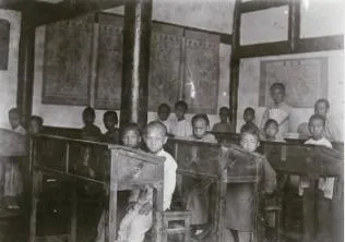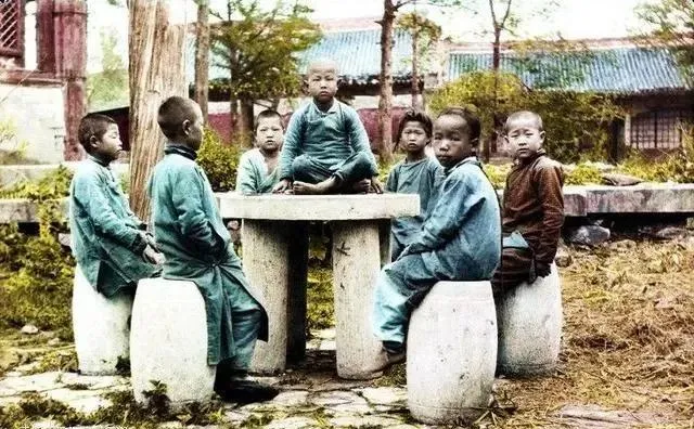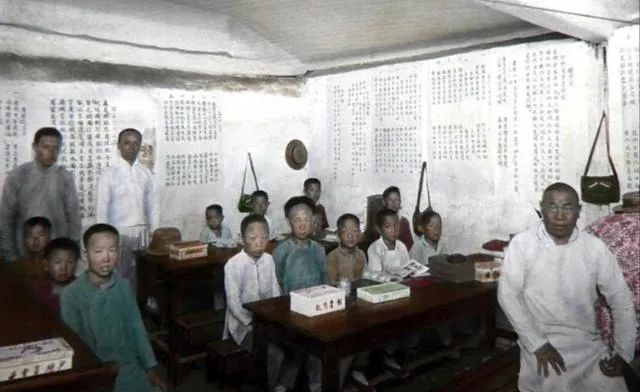 这个屋叫新式学堂,木桌窄凳一字排开,孩子们端端坐着,墙上贴满大字表,老师背手站角落里,拿戒尺点一下就有人起立背书,放了学,院子里一块石桌成了临时棋台,几个娃叽里呱啦抢位置,谁坐中间谁就当先生。