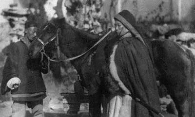 这位披着皮氅牵着马,马毛顺亮,鼻圈紧着不放,旁边老仆递过来手炙,暖一暖指尖,转身就上路,城外风沙大,得快走。