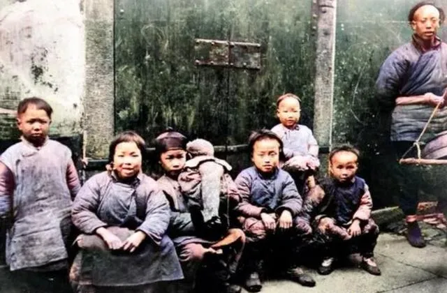 这几拨孩子站成三堆,脸上糊着尘土,衣裳肥大到要用带子扎一圈,最小的蹲在门槛边上啃干馍,远处有土屋和烟囱,风从空地穿过,衣角哗啦响,想想现在小朋友书包一个比一个新,那会儿能吃饱就是好日子。