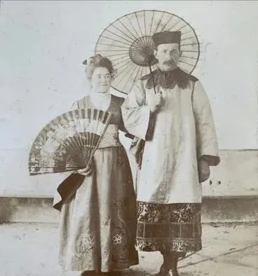 这位小娘子手里的折扇边缘描金,头上花团簇的新式簪花往后一压,裙摆是宝蓝拼海水江崖纹,走起路来沙沙响,我外婆看见笑,说那时候姑娘家出门要有人牵着,脚下绣鞋不沾土才体面。