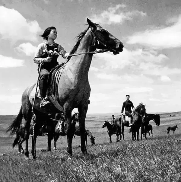 △1952年,内蒙古锡林郭勒,草原上骑马采花。
