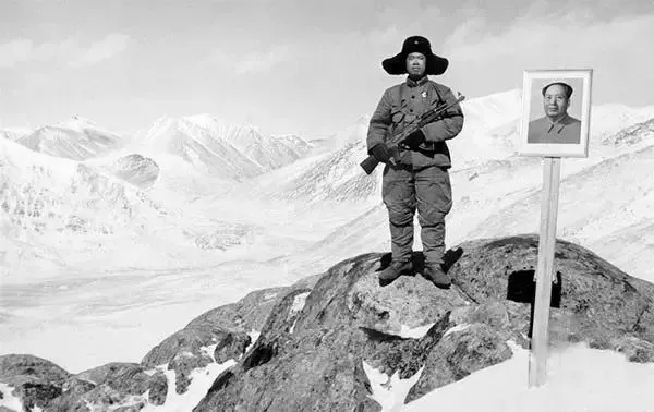 △1969年4月, 一位解放军战士守卫在新疆边境。
