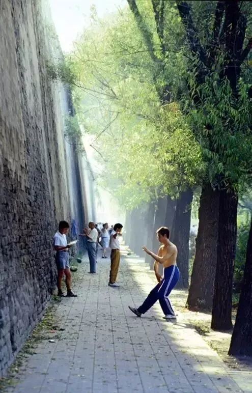 △20世纪70年代,故宫东华门城墙下早读和锻炼身体的人们。