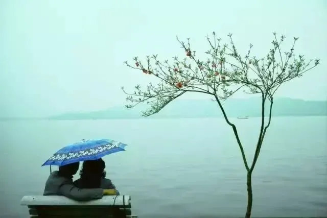 △杭州西湖边公园游玩的游客,天空下着小雨。