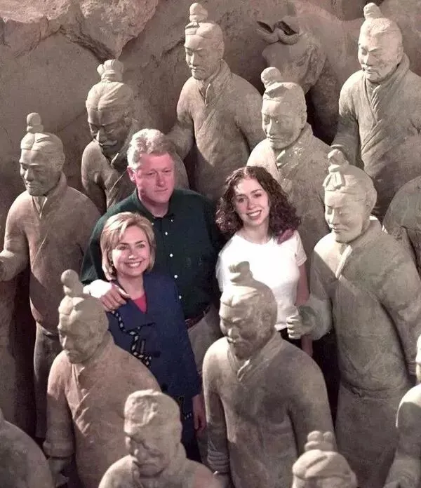 △1998年6月26日,西安,美国总统克林顿、夫人希拉里和他们的女儿参观兵马俑博物馆。