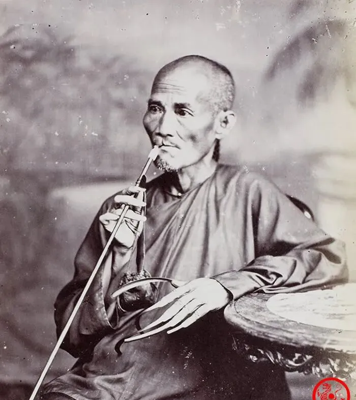 图中这位老汉叼着的是旱烟袋,细长的烟杆金属嘴,烟锅黑亮发黝,最扎眼的是他那一手指甲,修得又尖又长,奶奶看见这类照片总要嘀咕一句,这手可不是干活的手,旧时讲究人留长甲显体面,走起路来还得把手收着,免得磕了坏了面子。