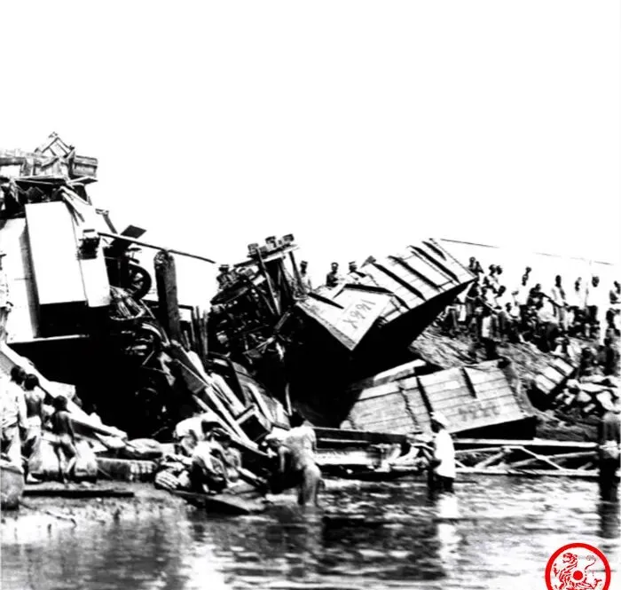 这个场景叫火车出轨,大堆车厢挤作一团,木料、铁件、行李全翻在水里,岸上人头攒动,远处还能瞄见裹着裤腿下水的救人者,爷爷说那会修路讲究不够,偷工减料的事儿常有,养路的也不够人手,轨枕松了没人盯,一失手就是大祸,现在坐高铁两小时跨省,想想那时真是提心吊胆。