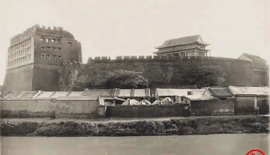 这处城头叫朝阳门瓮城,箭楼被炮火掀了顶,城砖露出斑驳的伤口,护城河边搭着一溜帐篷样的棚子,像是驻防或募工的临时住处,那时候城门是城的脸面,现在城市越修越平整,高楼一圈圈往外冒,回头看这堵墙,倒像给我们提了个醒,总有东西该留住。