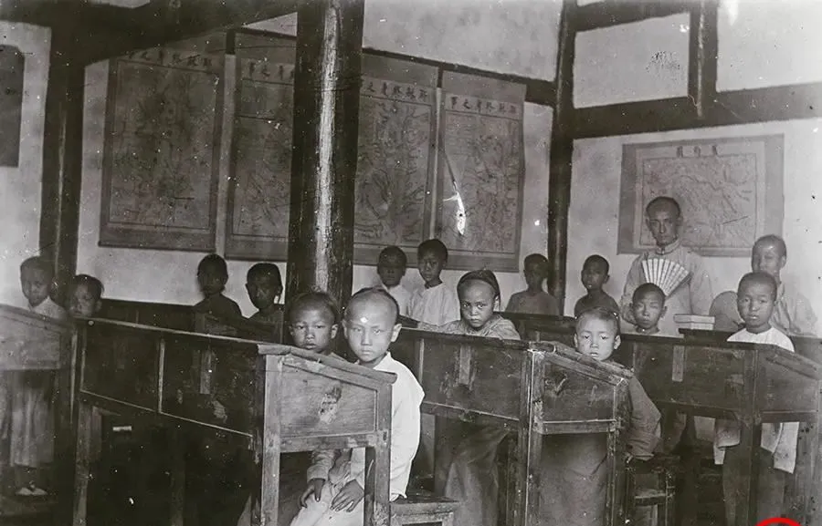 这个屋子叫新式学堂,木桌成排,黑色立柱当中梁,墙上挂着地图和插图,老师手里摇着折扇,孩子们坐得直挺挺,眼神里有点好奇也有点紧张,我记得外公讲过,改科举那几年风气突变,念书不再只背八股,要学算术地理,以前读书为进士,现在读书为世界。