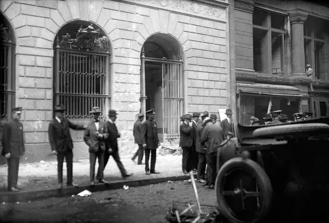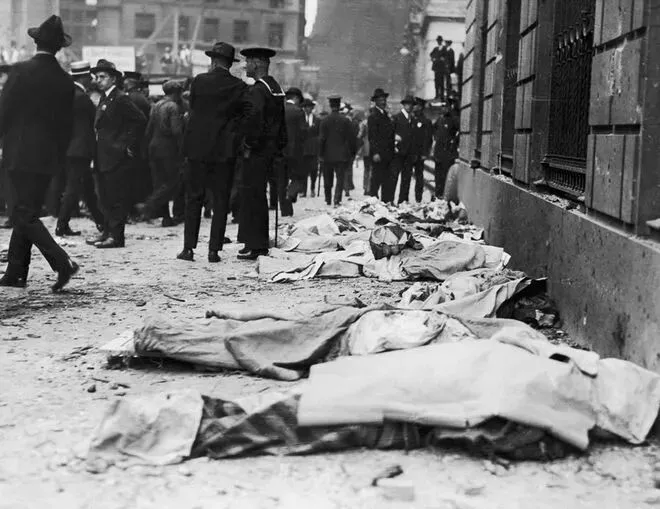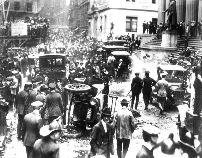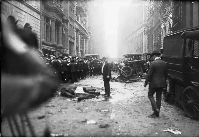 那天中午,华尔街像往常一样熙熙攘攘。银行家、经纪人和办公室职员正赶着去吃午餐。一辆老旧的马车缓缓停在华尔街23号摩根大通银行对面的狭窄街道上。车夫神秘消失后不久,马车突然爆炸,威力之大将500磅重的金属碎片抛向四面八方。