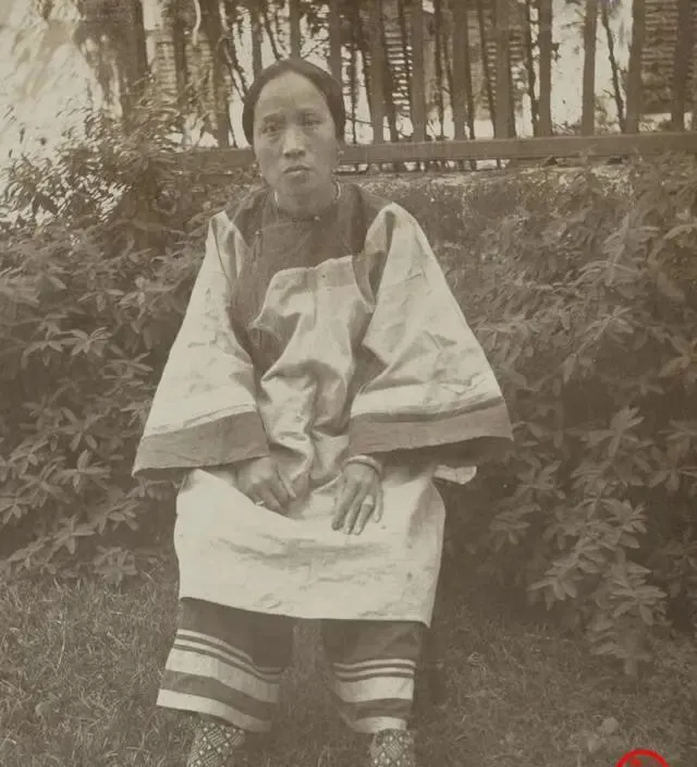 这个坐在灌木前的女人穿的是汉家袄裤,袖口宽宽垂着,脚上裹着三寸金莲,鞋面密密绣花,她神情发直,眼睛却往镜头边上躲,妈妈看了小声嘀咕,第一次照相都紧,别说她了,那会儿拍照还当要紧事,衣缝里塞着一只小香袋,走起路来脚不着地像在飘,现在谁还裹脚呀,运动鞋一蹬,地铁里能跑能挤。