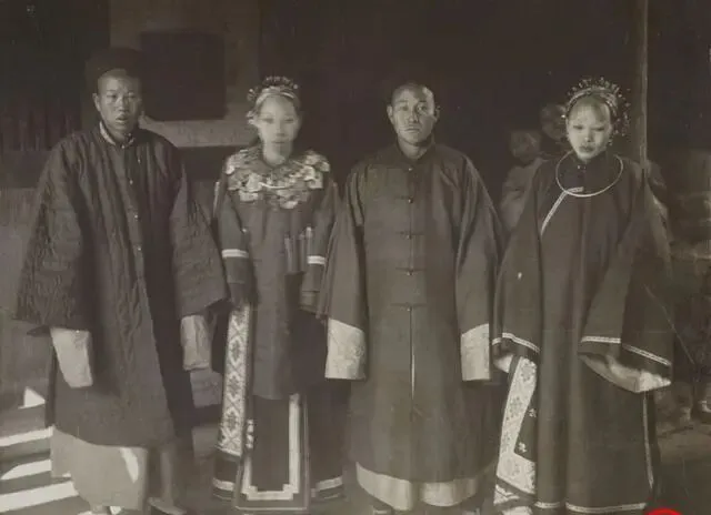 这两对站在影棚里的男女就是新婚夫妻,新郎穿绵袍,新娘戴步摇,脸上不笑也不哭,像被人喊了“别动”就定住了,右边这位新娘眼神躲躲闪闪,额心抹得亮,估摸是头一回对着黑大盒子,我妈看着直乐,说你爹结婚照也这样,一点都不敢眨眼,现在拍婚纱呢,连笑都能修出来,挑个角度就能浪漫一整天。