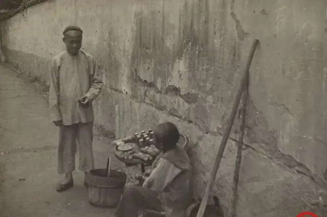 这个小摊最显眼的是一筐甘蔗,旁边摆小刀小秤,男孩坐小凳上仰头看客人,墙根儿阴影里还放着一只木桶,男人摸出几个铜子儿,少年利索地把蔗节剁断,递过去一节新切的,汁水顺着刀背流,甜味拌着灰尘味,小孩大概想着今天能不能多卖两根,攒够钱去对面铺子换一粒糖,现在路边卖甘蔗常见是电动小车,灯一亮,扫码一滴就走,哪还听得见铜板碰秤砣的清脆声。