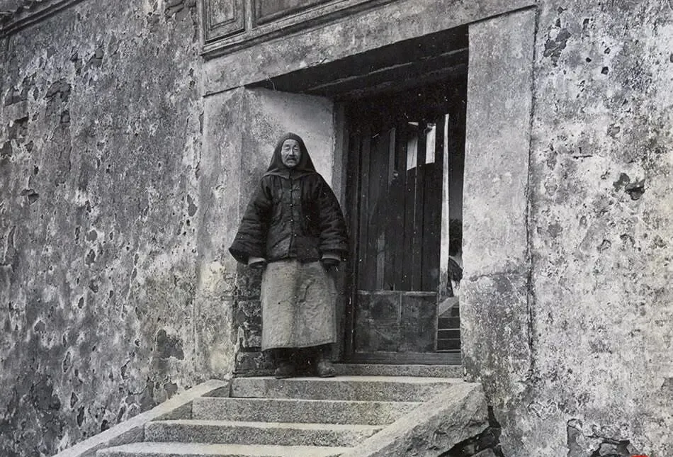 图里的老人站在寺庙门台上,棉袄鼓实,裙裤厚重,墙皮被风雨磕成一地斑点,石阶被脚底磨得亮亮的,爷爷看见这张就笑,说以前上香要早,撞钟之前到,香火旺的时候,门口总有老人帮看鞋,给你塞个木签记号,一文钱管一天。