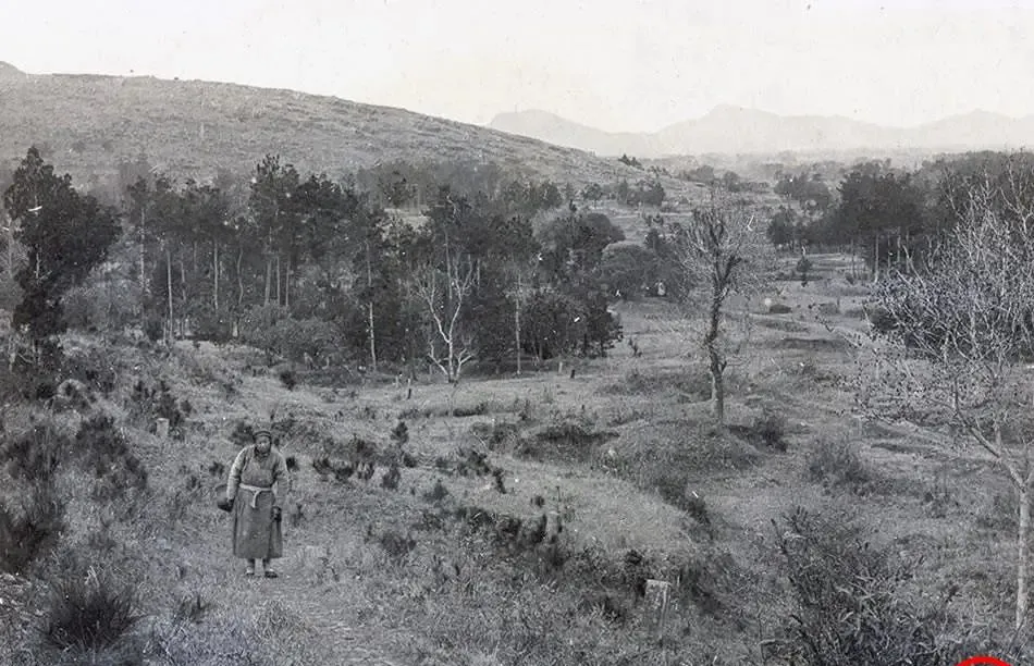 照片里城外不高的山包铺着一层草皮,树是细劲的,风往坡上一扫,能看见草籽翻白,路不宽,土埂上踩出小窝窝,背篓的女人走得不急不慢,腰间一把小镰,回村就能做晚饭,城里是绸缎的光,郊外是泥土的香。
