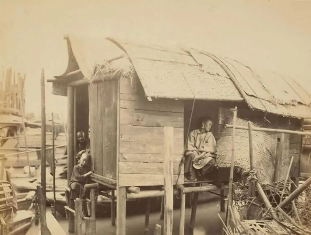 图里这类窝棚叫竹脚屋,几根木桩把房子架在水面上,屋檐盖的是草席和破席片,缝隙里透风,一家人坐在门口沿子上发愣,旁边堆着渔篓和竹片,潮气一天比一天重,手一摸都是黏的,听老人讲,涨潮的夜里最怕桩子吱呀一响,心跟着一沉。