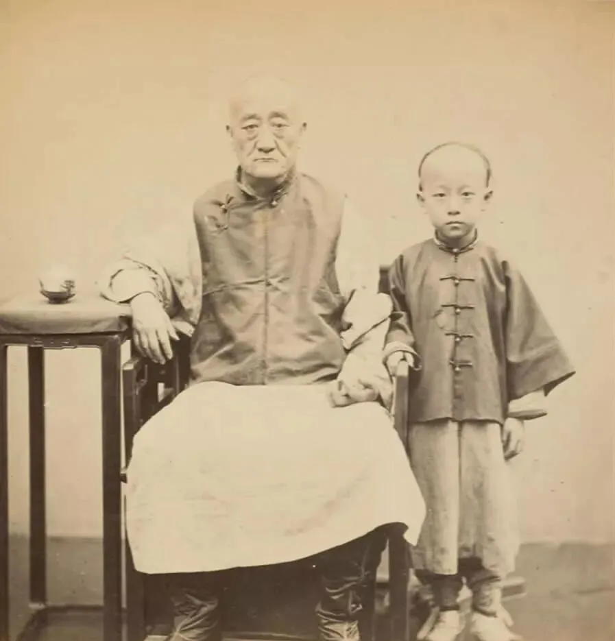 图里这双黑色的高靴叫官靴,老者穿的是便褂,腿上搭围裙,身旁小男孩抓着他的袖口,不笑也不哭,桌上放一只小盖碗,像是特意摆的,爷爷说,穿上官靴的人,多半在衙门里有个差事,哪怕不大,出门也有人让个道。