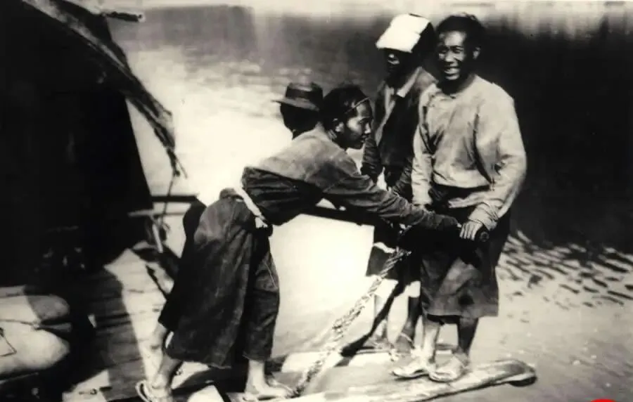 这个场景叫拉纤,粗链子绕在木桩上,船夫脚下踩木蹬,身子往后一仰就把船身牵动了,笑一笑也只是给同伴打个气,胳膊上青筋鼓得像蚯蚓,水汽一扑脸,咸乎乎的,奶奶说,遇上逆水天,腰带勒出印儿,晚上一躺板铺就不想起来了。