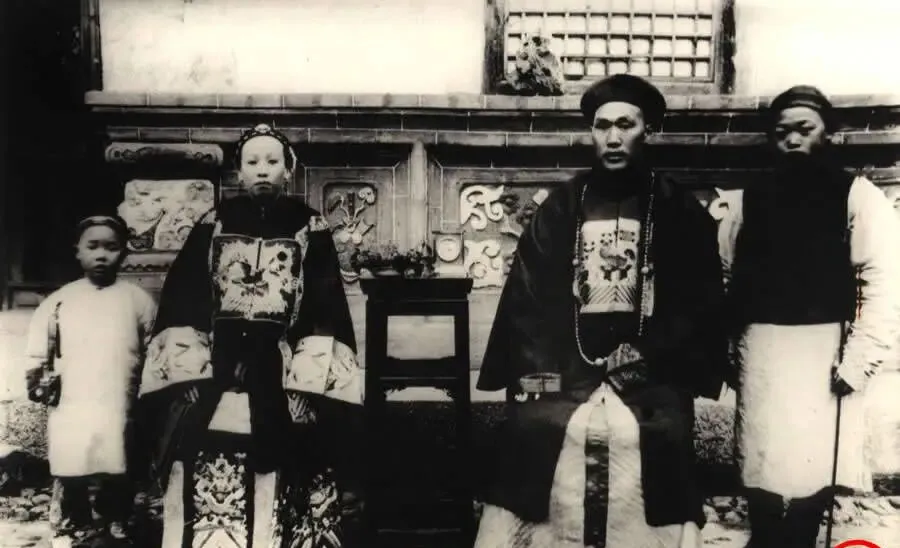 这个胸前一大块绣补的衣服就叫补服,绣着禽走兽是官阶的脸面,脖子上那串圆溜溜的叫朝珠,男主人坐着,女主人也穿了补服,说明她被封了命妇,站在旁边的小厮拎着手炉和纸套,神情拘着,妈妈说,以前拍这种合影要挑黄道吉日,衣服里垫棉都要熨平才敢上镜。