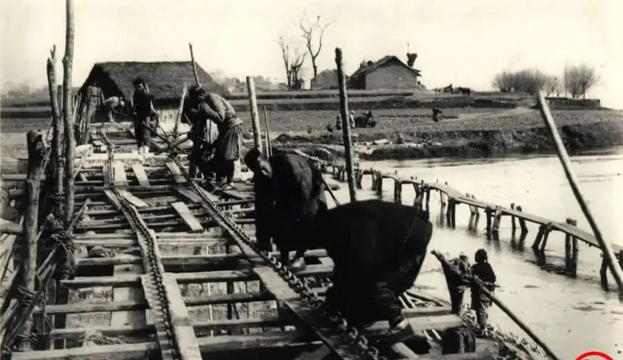 这个桥面是木板铺在两根大铁链上,铁链当龙骨,木板用麻绳和木楔子固定,弯腰的人拿木槌对着榫眼敲,另一个拎着铁钩校正链节,汉水风猛,帽子一歪就被吹走,以前修桥靠肩背手搬,现在有吊机和安全绳,脚底也不用踏这晃悠悠的板了。