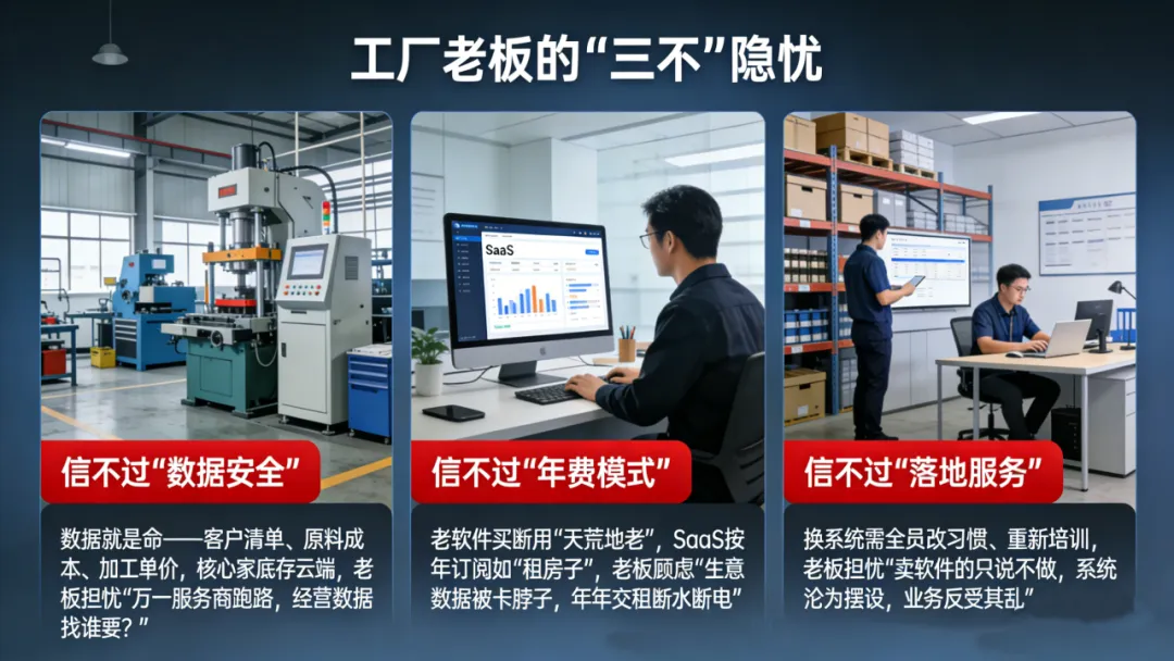 信不过“数据安全”:对工厂来说,数据就是命——客户清单、原料成本、加工单价,那是核心家底。SaaS把数据放在别人云端服务器上,老板心里直打鼓:“万一服务商跑路了,我这么多年的经营数据找谁要去?”这种案例,他们听得不少。