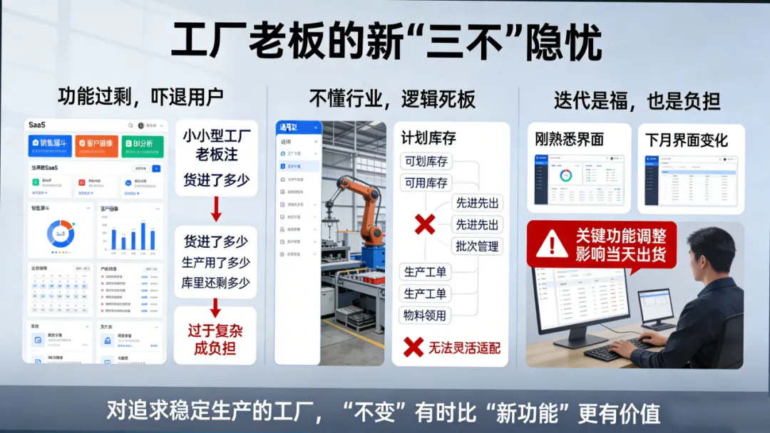 迭代是福,也是负担:SaaS频繁更新是优势,但对工厂却是挑战。员工刚熟悉界面,下个月又变了;一个关键功能突然调整,可能影响当天出货。对追求稳定生产的工厂而言,“不变”有时比“新功能”更有价值。