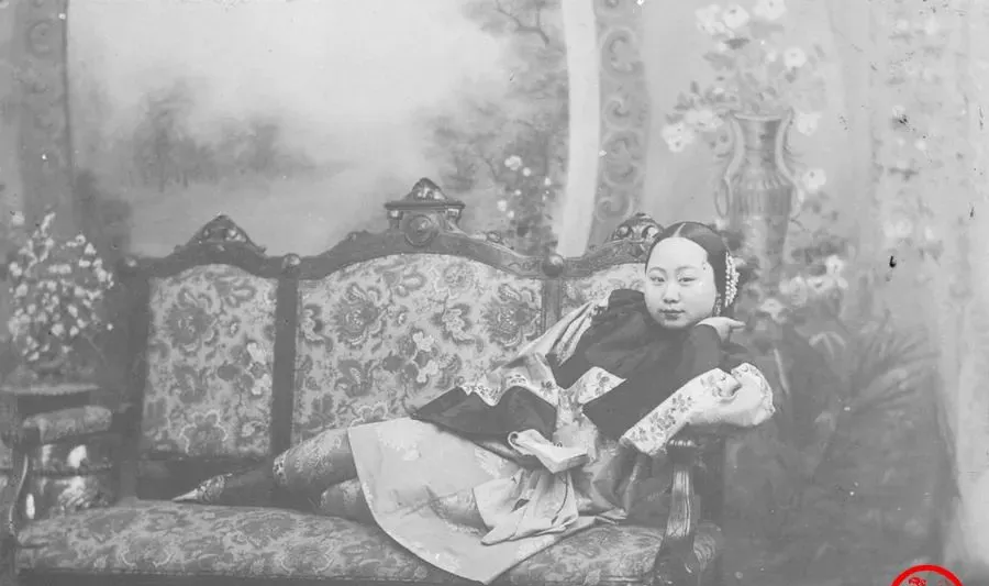 这个躺在花沙发上的叫闺秀照,靠枕鼓得高高的,绸面闪着冷光,袖口翻边压着缎管,鬓角别一枚珠花,姿势半躺半倚,左手按书脊,像刚读到个妙处,摄影师很会摆,镜背挂了山水屏,虚虚的,衬出她的圆脸和平缓的神情,妈妈笑我说,你看人家不费劲就时髦了,现在拍照反倒容易过了头。