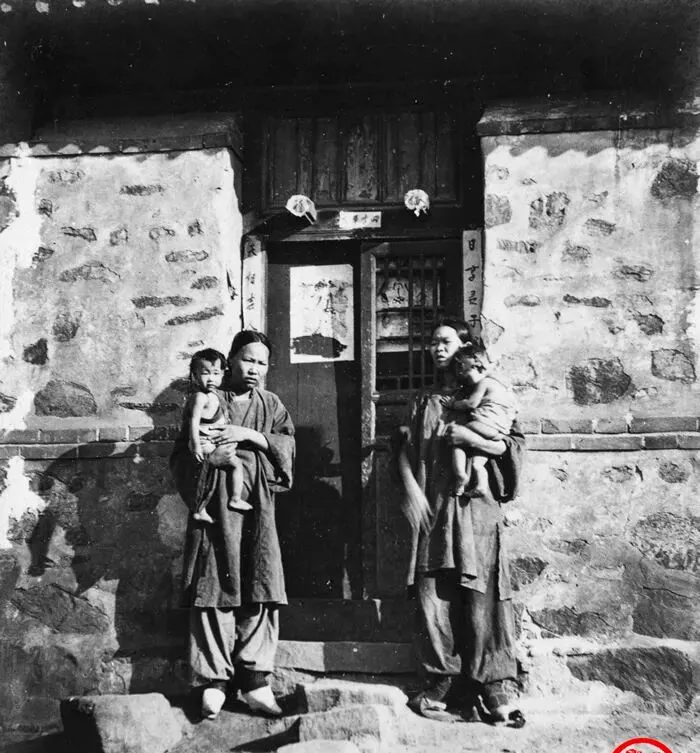 这个院门口的场景叫邻里串门,两位女人一人抱一个孩子,门框上贴着残联的门神,石缝墙灰浆斑驳,光从右侧斜斜打过来,孩子赤脚,脚心黑黑的像刚从土路上跑回来,小时候我在老家院里也爱光脚,奶奶总叮嘱,地上有刺,别扎了,现在哪还有这么粗粝的地面,楼道瓷砖干干净净。