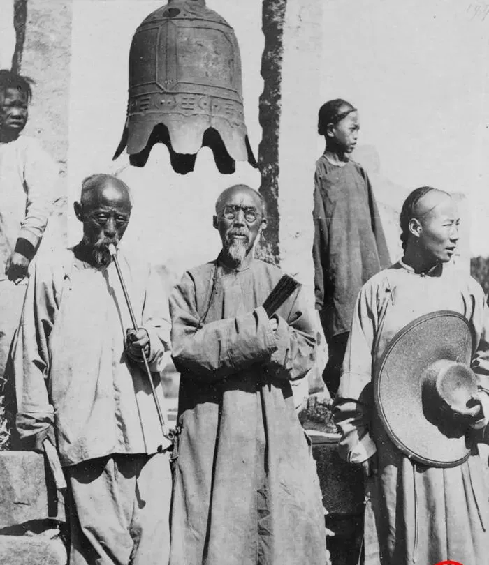 这张里最大的物件叫铜钟,悬在梁下,边角磨得圆润,钟腹有浅浅的纹,三个老者站在下面,一个叼着长烟袋,一个握着折扇,一个手搭着草帽檐,胡须白得亮,眼神却清,风一吹,钟舌轻轻碰壁,叮的一声短促地散开去,外公说,听得见这样的声气,心就静一半。
