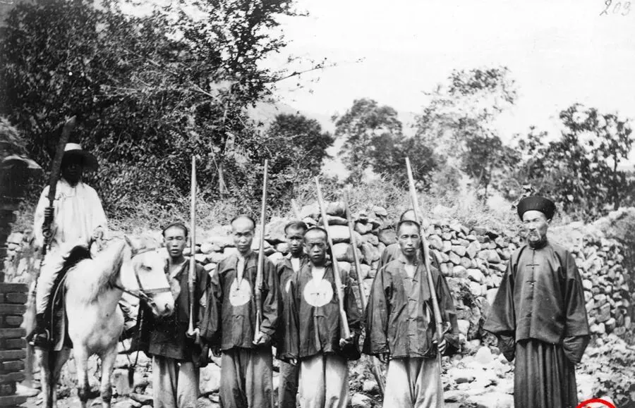 这几位拿长枪的叫团丁,两边各有头领,一人骑着小白马,一人着长袍立在队尾,胸前木牌圆圆的,写着号字,后面是乱石堆和树影,脚下草根缠着脚面,他们要干嘛呢,平时在田里弯腰割草,遇事就扛枪出门,奶奶说,有时候也就吓唬吓唬人,真打起来,心里还是怵的。