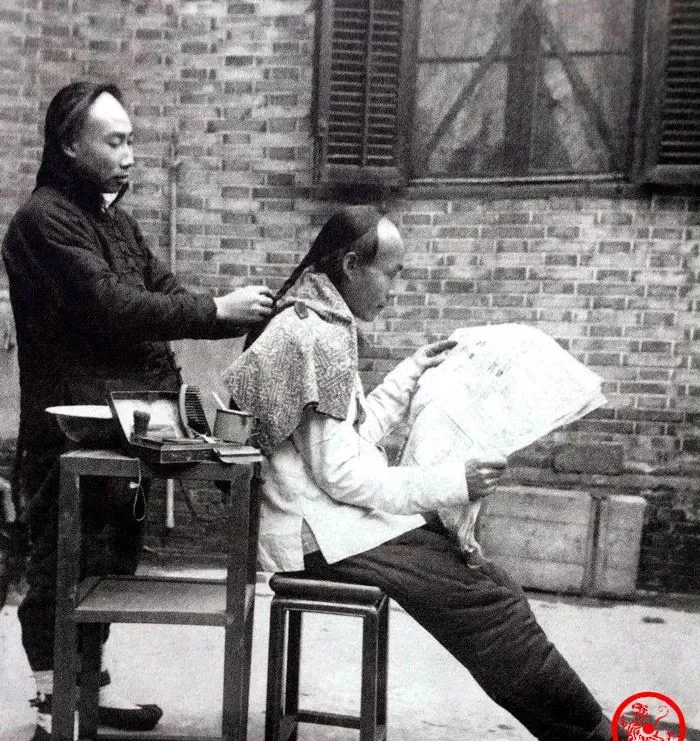 图中这摆着架子的小摊叫剃头摊,手里那把细齿木梳顺着长辫往下抹油,辫梢缠着黑绸带,坐着的爷们一手撑报纸一手按着衣襟,肩上搭着防沾的碎花巾,砖墙窗棂都露着洋式味道,说明是城里街巷,师傅指尖很稳,蘸油抹、掐、辫、勒,一气儿走完,奶奶说那时候出门辫子不齐可丢脸,遇喜事还要把辫梢扎个新穗子,以前编辫子是规矩,现在理平头是干净,换了个审美罢了。