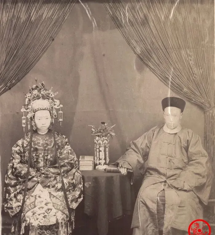 这个端坐着的姑娘穿的是凤冠霞帔,头顶垂珠摇曳,胸前团寿纹明晃晃的,裙面缀满绣金线,旁边那位新郎袍褂宽大,手搭在桌沿上,案上摆着花瓶和书,像是特意点个文气,妈妈看了笑,说你看那会儿拍照都绷着脸,别说笑,眨眼都不敢,那时婚照是郑重的存念,现在婚纱一拍能有好几册,可热闹了。