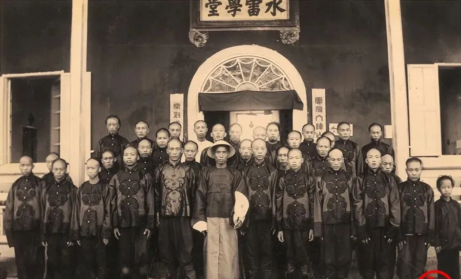 这排深色绸背心的学生站得齐,衣襟绣着对称纹样,头顶光亮,门匾上横书“水雷学堂”几个大字,门洞是半圆窗套,中央老先生握着折扇,扇骨外翻有点帅气,合影的味道很熟悉,像极了咱现在的毕业照,只是那时学的是雷火与电线,以前学新知要顶着风言风语,现在新专业一出全网跟学,潮水的方向变得更快了。