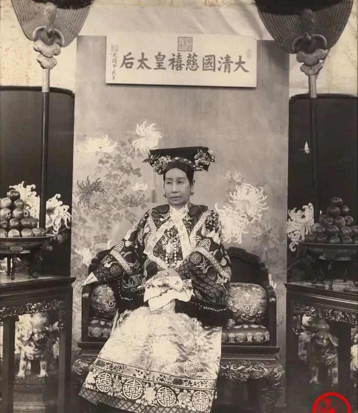 这个端坐在雕花太师椅上的人穿着朝服,领口密密叠着珠串,袖口滚着云纹,身后屏风正中挂着“大清国慈禧皇太后”的匾,字体端硬,面色却不显老,光打得匀,皮面平整,旁边案几上堆满果盘和摆件,看得出是拍给洋人看的排面,外婆感叹一句,这位懂得折腾脸面,会保养也会摆阵仗,以前权力也靠形象加持,现在镜头前的管理学一样少不了。