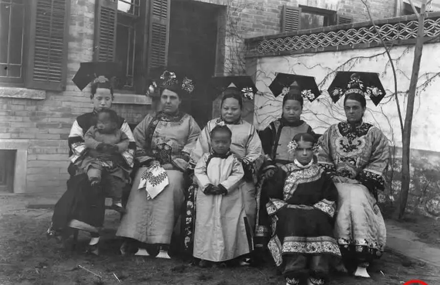 这张最有意思,几位妇女坐成一排,发髻上大翅挽起,花朵坠子垂到鬓边,两个外国太太也穿着旗装,腰身勒得直,领口方方正正,怀里还抱着娃,孩子怯生生看镜头,墙根的葡萄枝盘在窗下,说明是宅院里拍的,妈妈说衣裳只要合身,穿谁的款不一定看出违和,以前中外服制借来借去,现在也是互相借色借版型,世道一通百通。