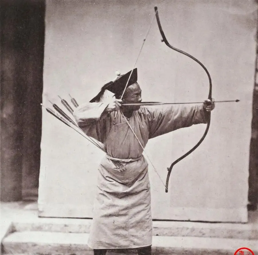图中这位八旗兵正拉着一张反曲大弓,弓身弯得像月牙,箭羽一排插在背上的箭囊里,右手三指勾弦,左臂绷得直直的,整个人像一张拉满的弓,军营里把这叫“满弓见月”,老辈人讲那时候骑射是硬功夫,热兵器上了场子也没把弓弩给撂下,校场验兵时先亮弓法,能一气三箭不抖的,才叫有底子。