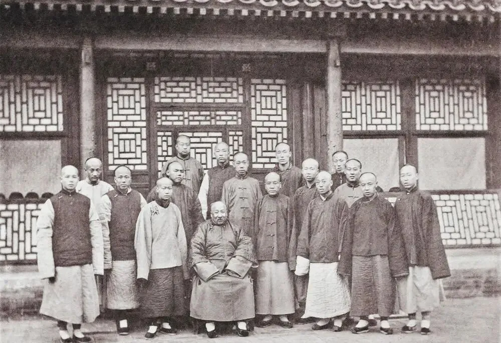这张里坐着的是位老先生,身后站着的年轻人清一色长衫马甲,脸上都还是学生气,窗格子是回字纹,拍照那会儿可不随便笑,父亲看见这张就乐,说“你看站中间那小个头,腰板多直啊”,那时候学问像块压舱石,揣在肚里走哪儿都硬气,现在我们拍毕业照要凹造型,他们站好了就叫规矩。