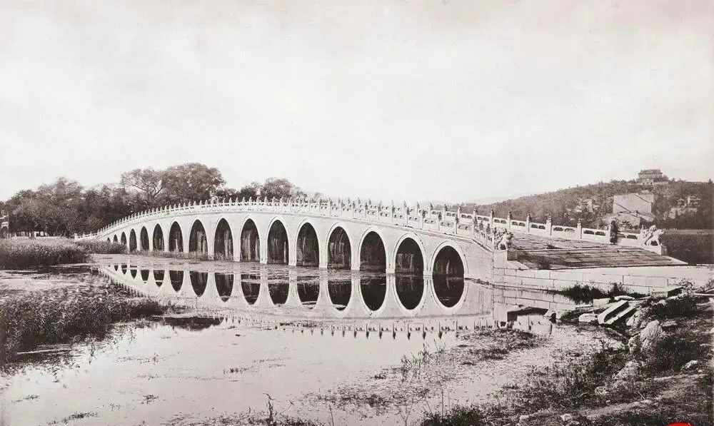 图里这座长桥叫十七孔桥,汉白玉栏板一排望兽趴着,拱洞对着水面,像串起的一溜月亮,风小一点就能把桥影倒得整整齐齐,以前颐和园里起风多,船从桥洞穿过去,桨叶在水里“扑哧扑哧”的,岸上卖茶汤的人把铜壶往炭火上一搁,热汽就涌出来了,现在我们看桥拍照讲角度,那时候人家过桥是办事,桥是路不是景。