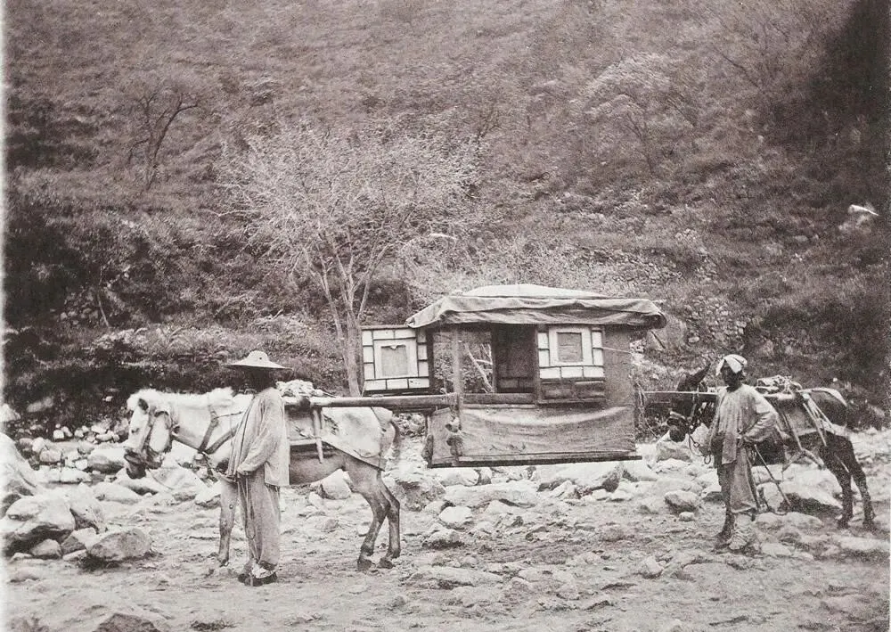 这个两头架在骡背上的叫骡驮轿,长长的辕杆像两条胳膊把小屋子抬起来,中间吊着软轿厢,车夫一手牵辔一手理缰,走颠簸路它能像弹簧一样卸劲儿,娘说当年去外县探亲,一路就靠这玩意儿稳当,拐弯时得喊一声“慢点”,前后两头才跟着配合,不然一急一缓,就晃得人发晕。